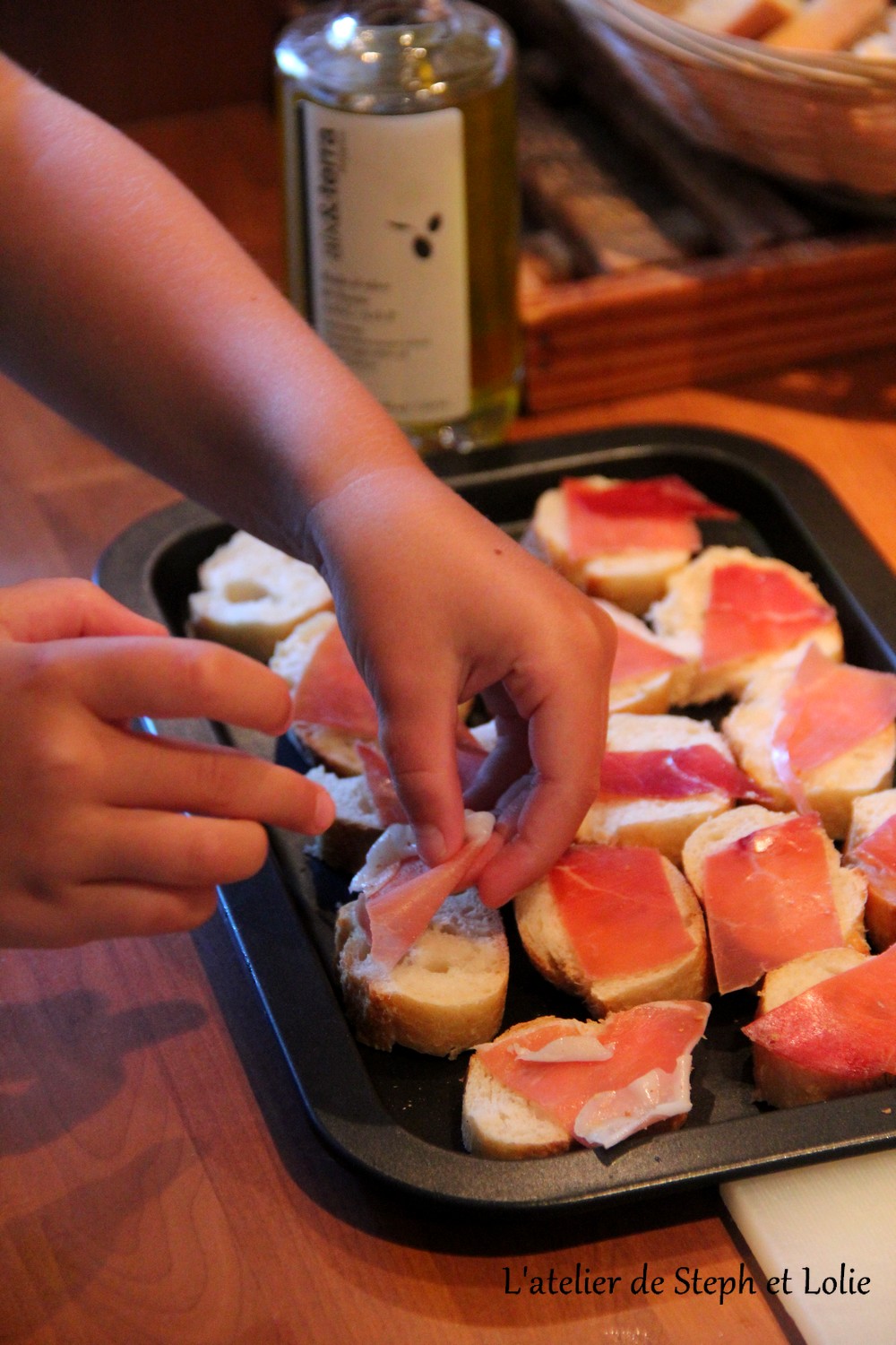 Y déposer du jambon fumé, 1 quartier de tomate, du sel, poivre noir du moulin et un filet d’huile d’olive.